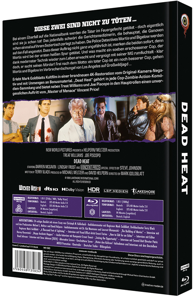 Erlebt Mark Goldblatts Kultfilm in einer brandneuen 4K-Restoration vom Original-Kamera-Negativ und mit Unmengen an Bonusmaterial. „Dead Heat“ gehört in jede Cop-Zombie-Action-Komödien- Sammlung und bietet neben Treat Williams und Joe Piscopo in den Hauptrollen einen unvergesslichen Auftritt vom „Master of Menace“ Vincent Price!