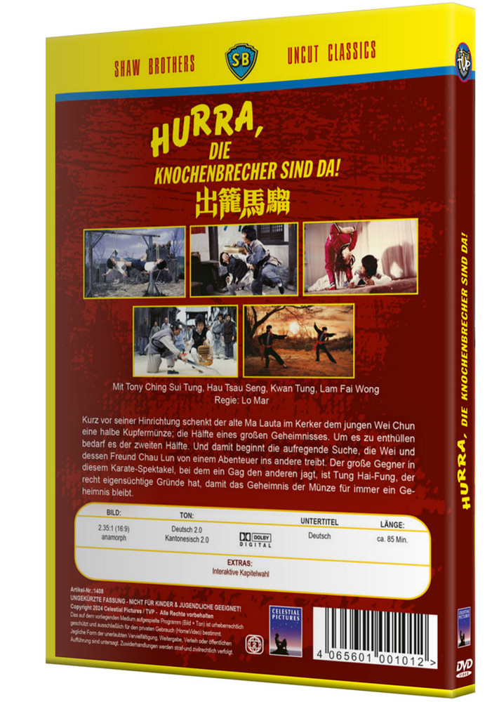 Grandiose Kampfkunst und schräger Humor mit flotten Sprüchen zeichnen diesen verrückten Klassiker des Martial Arts-Kinos aus. Mit Ching Siu-Tung (A CHINESE GHOST STORY 1&2), Hau Chiu-Sing (KNOCHENBRECHER HALT DIE OHREN STEIF) und Lin Huihuang (DER TEMPEL DER SHAOLIN).